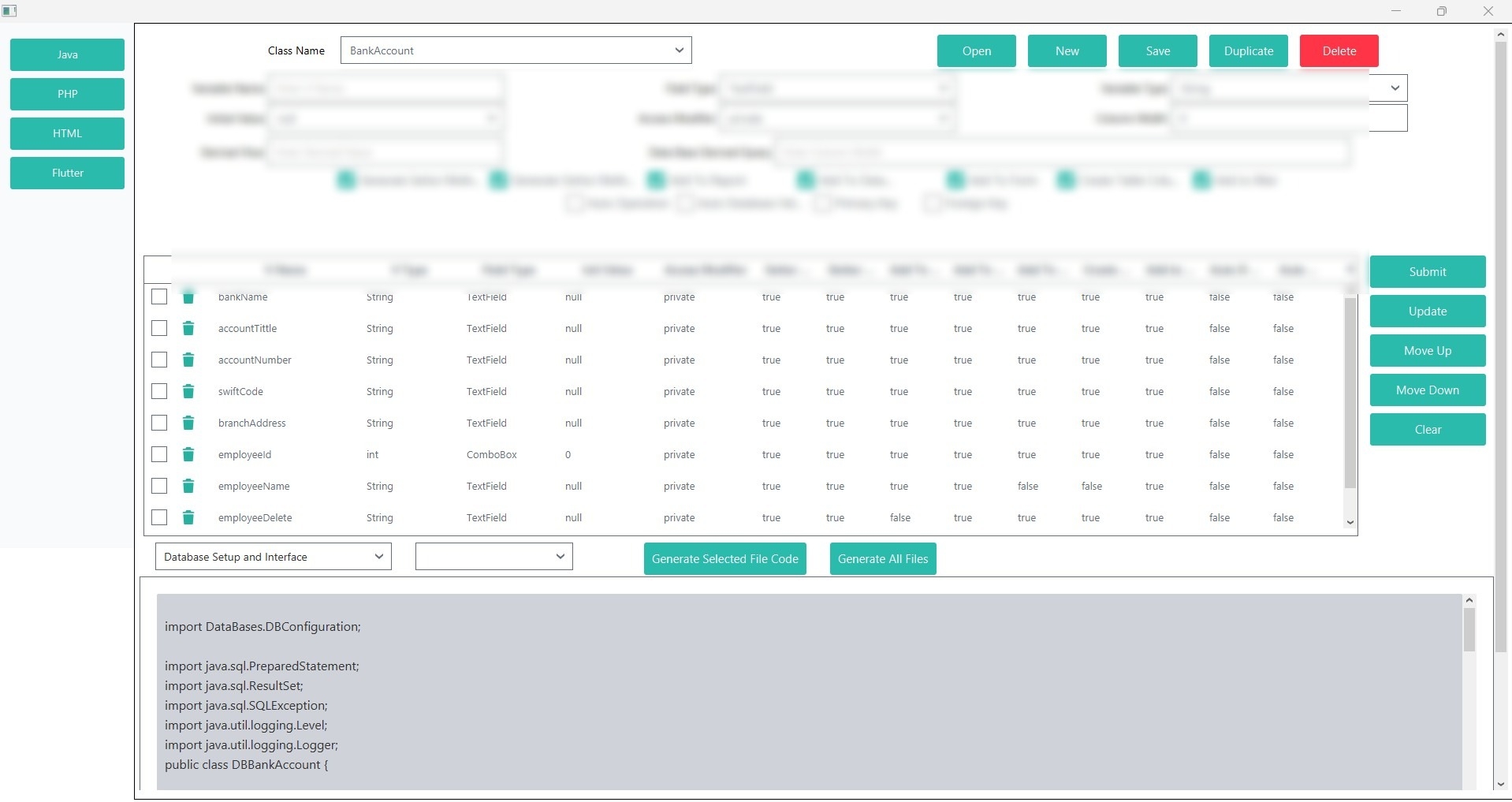 CAPSOFT is a powerful, user-friendly JavaFX desktop application that automatically generates complete, production-ready JavaFX code using minimal input settings. Its modern interface allows developers to define class names, fields, data types, UI components, access modifiers, and database options through a clean visual table, while instantly previewing generated source code in a live code panel. With features like form creation, CRUD operations, filters, navigation modules, database integration, field reordering, and one-click file generation, CAPSOFT organizes everything into modular, interconnected components that can be independently regenerated without affecting the rest of the project. By combining a smooth workflow with high performance and cross-platform compatibility, CAPSOFT enables developers to rapidly build large, professional, database-driven JavaFX applications with clean architecture and fully customizable UI and backend logic.